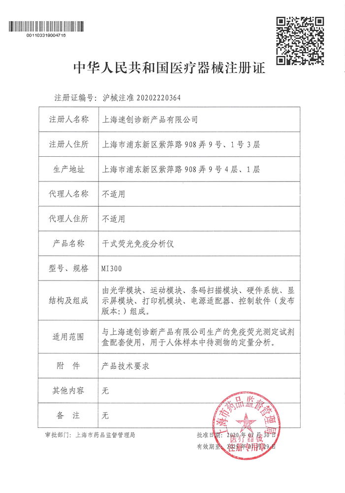 2020年7月30日,上海速創診斷產品有限公司“干式熒光免疫分析儀(MI300)”獲得上海市藥品監督管理局醫療器械注冊證。